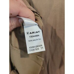 The ARIAT Women's Relaxed Fit Washed Jersey Tank in Petrified Oak is a stylish and versatile addition to your wardrobe. Made from a blend of polyester and modal, this tank features a ruffle accent and raw hem for added flair. Ideal for travel, parties, casual outings, or business meetings, the tank is easy to care for with its machine washable fabric. Its relaxed fit and lightweight design make it perfect for summer, fall, or spring seasons, while the solid beige color adds a touch of western-inspired style to your outfit.