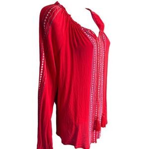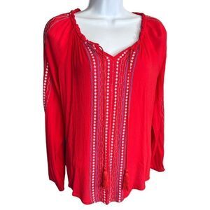 A pretty peasant blouse rich in color and detail. Fans of the classic bohemian silhouette will appreciate the gorgeous red hue, perfectly accented by multicolored, embroidered, tassel ties and a flattering gathered neckline. The flowy sleeves are softly gathered at the ends.