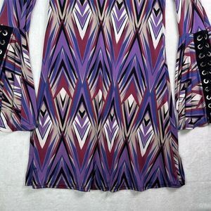 The Ariella Bell Sleeve Dress in women’s size Small features a Purple and multicolor geometric zigzag pattern and a knee-length midi design. It is crafted from a comfortable knit blend of polyester and spandex, suitable for all occasions like parties or cocktails. The dress has a round neckline, long bell sleeves, and a lace-up closure, embodying a retro and free-spirited Boho theme.