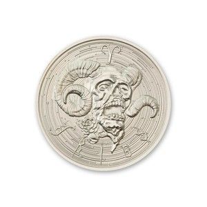 Obverse: A zombified, half-man, half-ram on a circular pattern with stars, with “ARIES” below, with the symbol for Aries above.