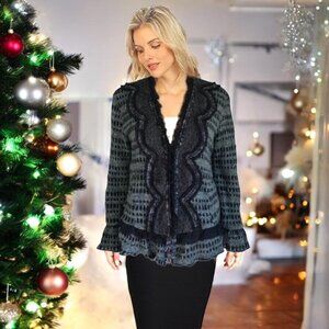 ARIS. A Warm, soft, luxurious grey/ black yarn with subtle silver thread, this cardigan features a scalloped placket and contrast ruffles. Long sleeves with ruffle cuffs, ruffle bottom hemline, ruffles along the placket and open front with eye and hook closure. Since this cardigan has lining it can be layered over a thin blouse or styled as a jacket. Acrylic/ Wool blend. Hand wash cold water. NEW with Tag Size M