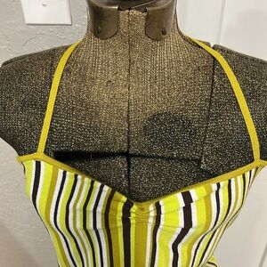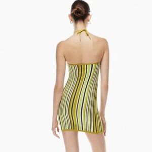 Women’s striped halter Aritzia Sunday Best JETT mini body on dress. Lime green/ olive green /white & brown. 62% viscose 38% polyester 1 small snag on back of dress as seen in pic. Please look at all pics and comment below with any questions