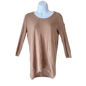 - Features: tight knit material, open back with tie at top, 3/4 sleeves, subtle high low hem, ribbed hems and neckline, lightweight