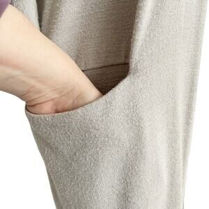 This is a longer version of Wilfred Free's beloved roomy, open-front cardigan. It's made with their signature Reposa™ fabric, a soft jersey knit that drapes beautifully. A blend of rayon, polyester and spandex makes for a super soft, comfortable layer. Color is a light beige-ish gray.