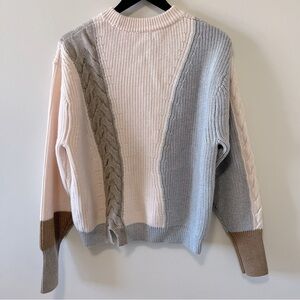 100% Merino wool sweater. Has a colorblock and mixed texture design. Features slit detail