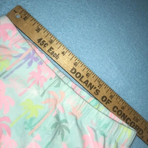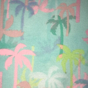 Minty colored with purple, pink, green, and neon green palm trees. Elastic waistband.