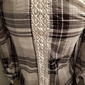 Great deal! Plaid with lace design in back make this a hip shirt for your teens wardobe. Silver threading and gray and black block pattern. New. Size 16 or Xl