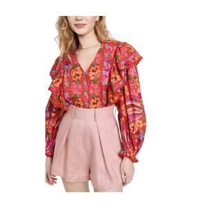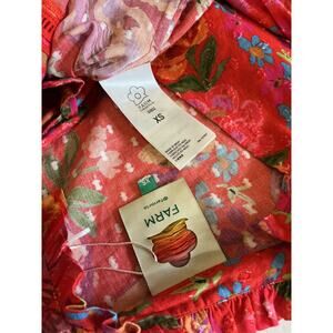 The FARM Rio �Red Spring Bananas� Blouse showcases a bold multicolor banana print on soft cotton fabric. Designed with a relaxed fit and vibrant palette, it perfectly embodies the brand�s playful tropical aesthetic. The blouse is in excellent condition with no visible flaws. Ideal for pairing with casual bottoms or layering for a lively, expressive look.