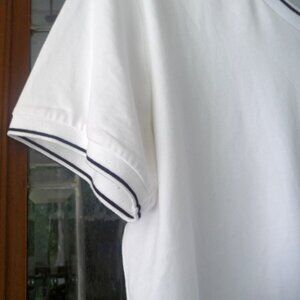 WHITE WITH BLACK TRIM AT NECK AND SLEEVES