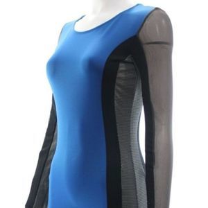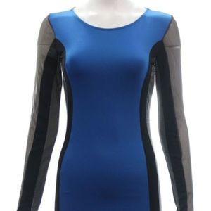 Armani Exchange Blue Bodycon Mini Dress With Grey & Black Contrast Siding, Sheer Grey Fabric On Arms, Tonal Stitching Throughout