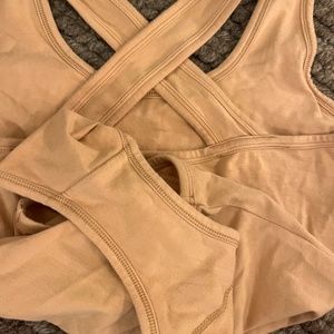 Wide cross-back straps for easy on and off, plus a deep scoop-neck with a simple front liner for a bit more support.