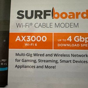 This ARRIS Surfboard G34 cable modem is perfect for reliable and fast internet access. With dual-band connectivity and Wi-Fi capabilities, you can easily connect to your network for seamless browsing. The modem has four LAN ports and Ethernet connectivity, making it easy to connect to your devices. The item has been tested and works perfectly, and comes in an open box. The black modem has a height of 9in., a length of 2.6in., and a width of 7.7in. It's compatible with DOCSIS 3.1 and has an AX3000 rating. This item is perfect for use in home networking and connectivity, and is categorized under wireless routers and computers/tablets & networking.