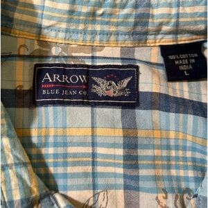 This Arrow Blue Jeans cool shirt is both plaid and printed with imprints of leaves throughout, very cool and in excellent condition.