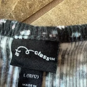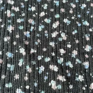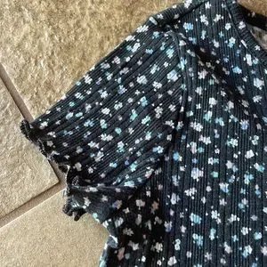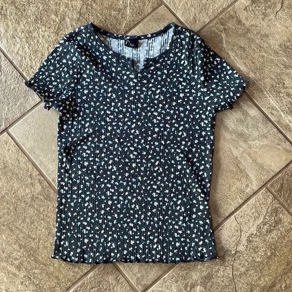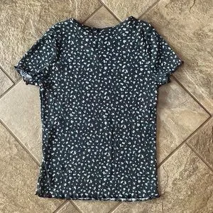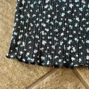 EXCELLENT condition, ribbed with ruffle accent at hem, black with all over floral print.