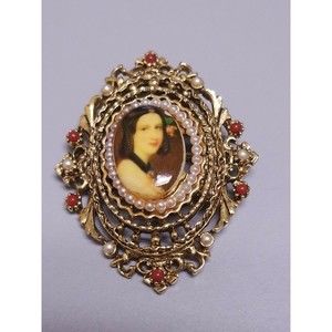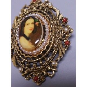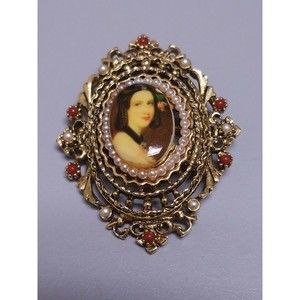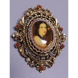 Description: ART Brooch Arthur Pepper Gold Tone Transfer Portrait Miniature Lady Jane Erskine Brooch Signed Arthur Pepper 1960's gold tone rust colored and white faux seed pearls.