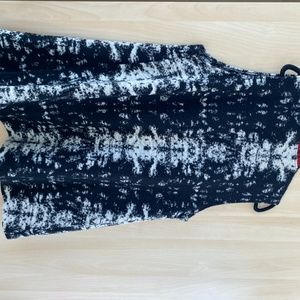 red, white, gray, black wool ART OF CLOTH vest over black cashmere asymmetric sweater, perfect condition