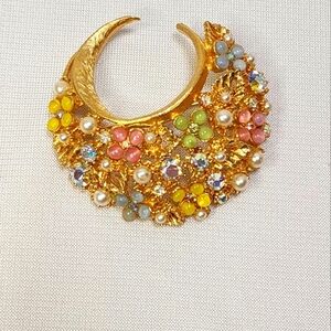 Vintage Arthur Pepper floral crescent brooch featuring gold tones with colorful pastel floral accents of blue, green, pink, and yellow. Pre-owned in excellent condition.