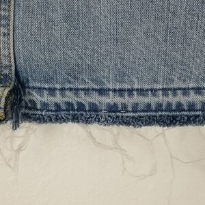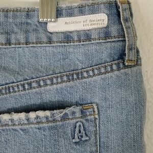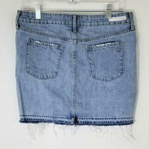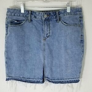 ARTICLES OF SOCIETY Distressed Denim Skirt, size 27. Raw edge hem. Functioning zipper with button closure. Front and back pockets. Front center bottom has been pulled open about 4 inches (see pic).