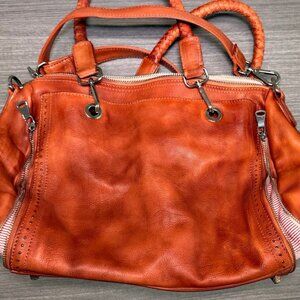 Authentic Old Trend Artisan Leather Satchel in a hand-distressed Brandy finish. Features iconic hand-braided handles and unique expanding side zippers with striped gussets for extra room when you need it. Exceptionally organized with two exterior zip pockets and three interior pockets. Includes original detachable crossbody strap. A rugged yet sophisticated everyday bag that only gets better with age.