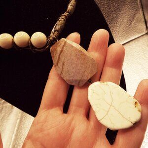 AMETHYST QUARTZ, BUFFALO WHITE TURQUOISE, PINKISH TAN GRANITE, GLASS, COPPER, LUCITE, LAVA FREEFORM DESIGN