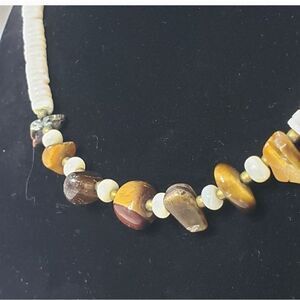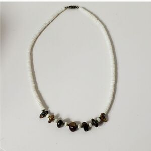 White shells cut into discs create an incredible necklace with brown tumbled stones that appear similar to Tiger's Eye.