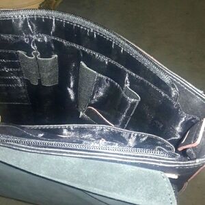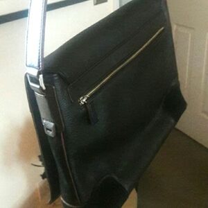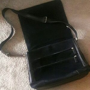 Handcrafted, geuine leather! This awesome Artisan messenger bag is a black, supple carrying case, perfect for transporting everything from your business documents to your laptop in style. It has beautiful, black suede accents, a matching, adjustable shoulder strap, and is in great, gently-used condition. On par with high-quality leather bags by #Frye. Make it yours today.