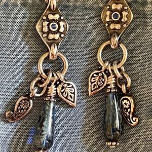 Limited edition earrings that feature repurposed and new silver colored metal findings accentuated by Picasso blue Czech glass bead drops.