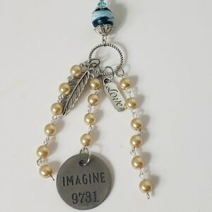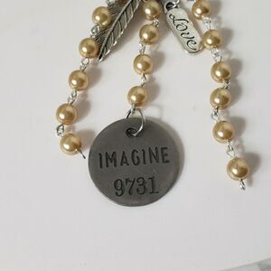 5" additional drop of Wire-wrapped bead, dangling faux pearl links, charms, and bronze IMAGINE metal disc.