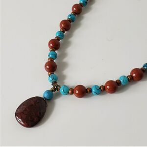 Stunning Jasper pendant and glass beads in colors of turquoise and terracotta.