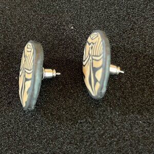 Zebra like design wood inlay pierced earrings. Artisan. Vintage. Hand made. New backs. Lightweight. Unique.