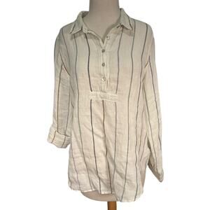 ARTISANNY 100% Linen Size Medium White Stripped Tunic 1/4 Button Down Lounge