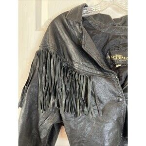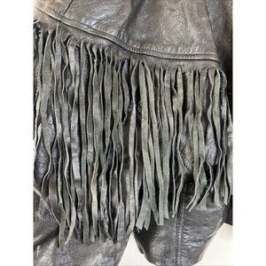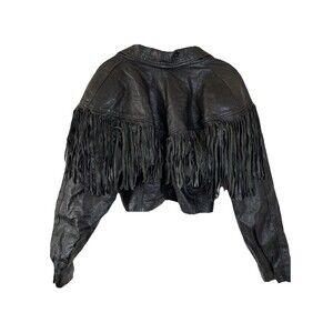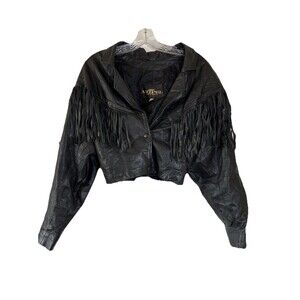 ARTPEL Fringe Crop Western Boho Leather Black Jacket Sz Small W/ Shoulder Pads