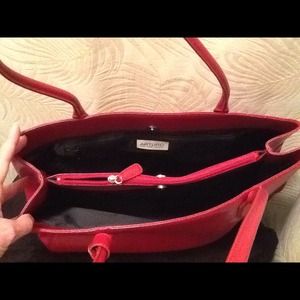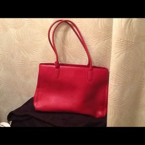 Red lizard leather shoulder tote bag. Two inside main compartments separated by center zippered compartment. One side wall zip pocket. Used only twice but perfectly clean and in immaculate condition. EXCELLENT overall condition, like brand new.