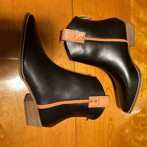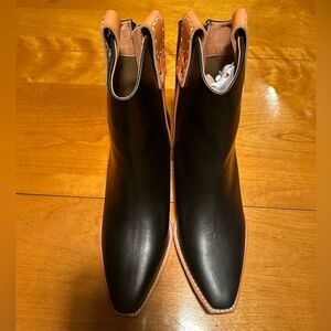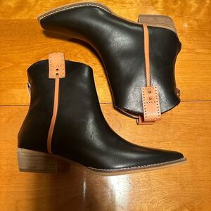 Well giddy on up! These ankle booties come in a beautiful black and have contrast saddle piping and pull tabs. The tabs have detail stitching and metal studs. With a square toe and a zipper up the back of the ankle, these boots are easy to wear and jazz up any outfit.