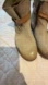Stylish tan leather ankle boots featuring a brown strap detail. Perfect for casual wear. Intentionally distressed and in good shape!