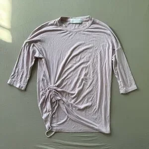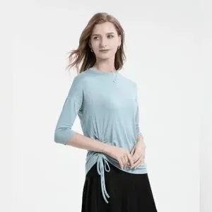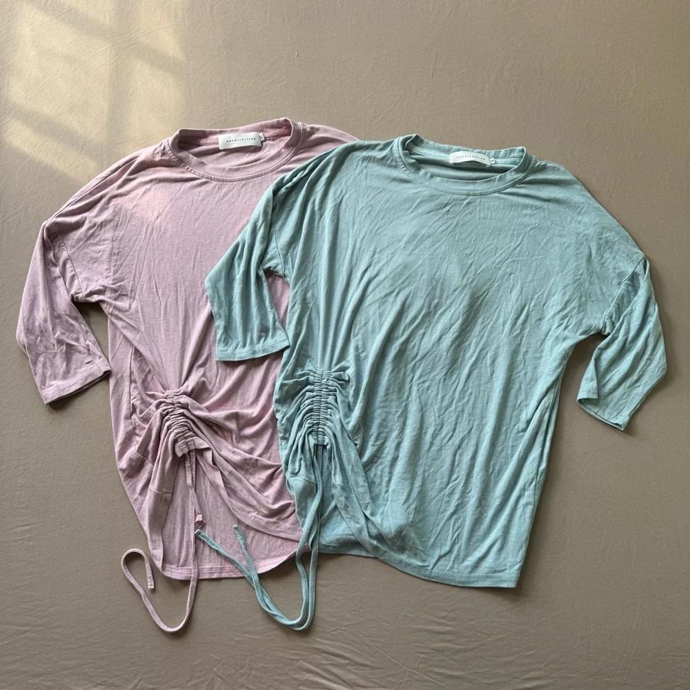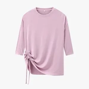 - These Soft & Lightweight modal Fabric tees feature a crew neck, drop shoulder, 3/4 sleeves, a side ruched drawstring detail, relaxed fit & pink & blue colorway