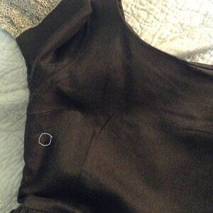 Condition: A number of issues, but possibly a clever seamstress could get around them. The fabric is flawed under the arms of the sleeve & bodice on both sides (not piling but felting or something -- nothing that shaving it could fix, unfortunately -- see photos 3 & 7). There is some damage to the lace of the front of the right sleeve (see photo 4) which might be reparable with some 100wt thread of the correct color. There is a small hole on the front bodice (see photo 5), which is not very noticeable and is in about the correct spot to be covered by a brooch. Finally, there is a small white spot on the front of the skirt (see photo 6) which is also not very noticeable. Although it was designed this way, I feel that it should also be noted that the zipper zips in the middle of the back & does not go all the way up. A clever seamstress could replace it w. a full 22" zipper, for it is unessential to the style for this to be so (as there's no collar with which to interfere