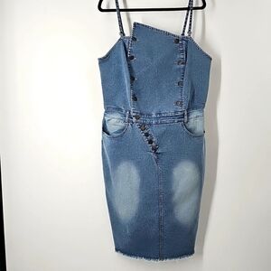 Ashley Stewart Stretchy 4-Pocket Denim Dress with Slim Straps, Raw Hem & Distressed Look. Asymmetric Neckline & Military Button Detail. NWOT. #25