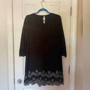 AS U Wish Size L black Embroidered Hem Pleated Front Lined Dress. 100% polyester dress with pull over style and beautiful embroidery design on the hem. Can be dressed up with a nice pair of heels or wear with flats for a more casual look. Dress has belt loops but belt not included. Could easily get some colorful ribbon to use if you wanted a more “fitted” look.