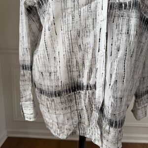 AS by DF 100% silk voile oversize blouse. Button front with V-neck and collar. Ivory with black abstract pattern. Please note this blouse is oversized. Laying flat measures 28 inches shoulder to ham and 22 inches armpit to armpit. Tax size extra small, but featured on my size medium dress form for scale. $325 retail.