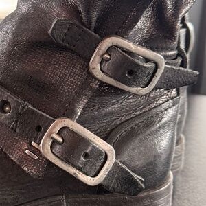 Edgy black leather moto combat boots with stylish buckle accents. Ideal for a bold statement.