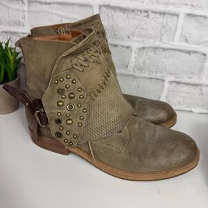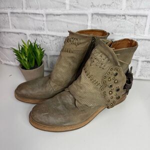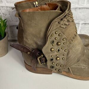 The height of embellishment! AS98 brings exquisite texture to these handcrafted boots in buttersoft, embossed leather (think silver scales) studded accents and adjustable, contrasting leather straps.