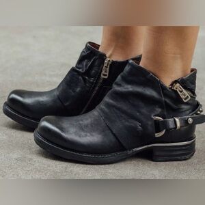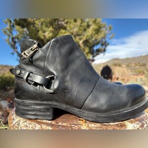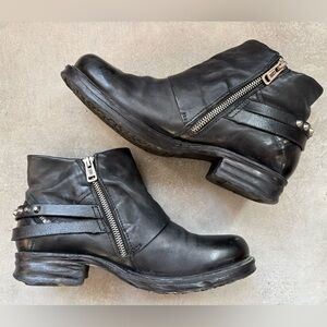 Wave hello to the A.S.98 Steve Boot, a moto-style ankle boot with a burnished finish and tons of stunning details. A diagonal wraparound zipper graces the heel, joined by an inner zipper for easy on/off, and criss-crossing straps at the rear are embellished with metallic slides, studs, and loops. This returning favorite is a best seller for a reason!