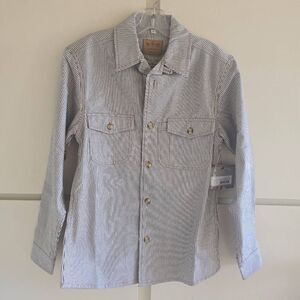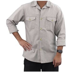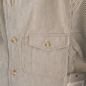 Vintage railroad stipes share the classic professional look; sleeves roll for more relaxed look
