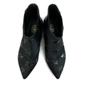 Ash Bliss black ankle boots featuring patent leather stars over a calf hair/pony hair background. A pointed toe, accented twist on a Chelsea bootie!