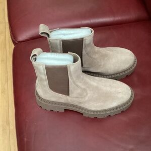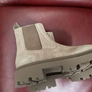 NWOB size 37 Step out in style with these ASH Chelsea Boots for women. Crafted with a suede calf leather upper, these ankle boots feature a rounded toe and a segmented rubber sole for added comfort and durability. The heel tab adds a touch of uniqueness to these classic boots. The lining and outer material are made from a combination of high-quality calf leather and fabric, while the sole is made from 100% rubber. Elevate your fashion game with these versatile and trendy Chelsea Boots from Ash. ** Note 3rd pic is to show style the color is tan.