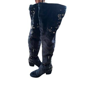 Step into elegance with these boho thigh high boots in black velvet with gold embroidered ethereal moons & stars decorating the full rise of the boots.