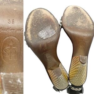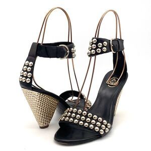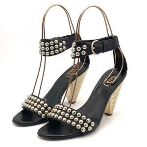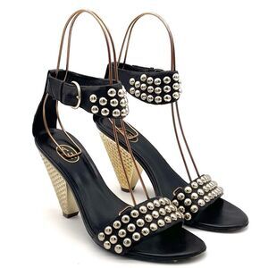 ASH Gold Studded Black Leather Ankle Cuff Heeled Strappy Sandals Size 38 | US 7