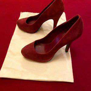 Rich burgundy suede heels Smooth suede upper and rubber sole 4" heel with 3/4" platform Lightly used Original protective bag