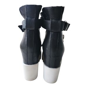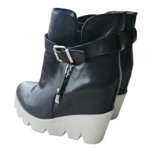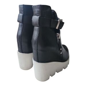Step up your shoe game with these bold RICKY black leather platform wedge boots featuring dramatic white jagged soles, side zippers, and buckle strap detail. These edgy, high-fashion ankle boots blend style and statement with comfort and height—perfect for streetwear, club looks, or standout everyday wear.
